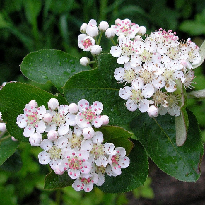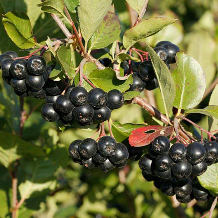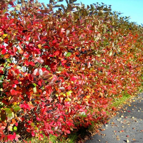 Арония черноплодная (Arónia melanocárpa). Многолетний листопадный кустарник раскидистой формы. Высота до 2,5 -3 м, до 1,5-2 м в диаметре. Листья: блестящие темно-зеленые. Особенно декоративно смотрятся осенью когда окрашиваются в оранжевые и багряные тона. Цветение: июнь-июль, плоды созревают в сентябре – начале октября. Цветки белые, реже розовые, собраны в плотные крупные щитковидные соцветия. Свет: требовательна к свету. Влага: влаголюбивая культура, для созревания плодов полив в засушливые периоды обязателен. Почва: предпочитает плодородные, но растет и на супесчаных и на легких суглинках. В целом арония – неприхотливый, зимостойкий кустарник со съедобными плодами. Подходит для создания крупных декоративных живых изгородей и одиночных посадок. Интересно смотрится и в период цветения и осенью