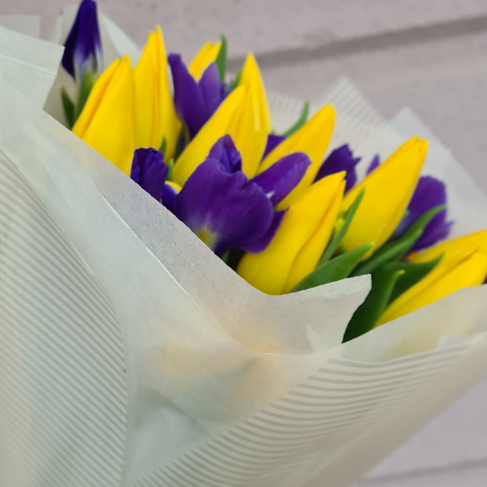 Прекрасный весенний букет, который будет уместен и для близкого человека и для коллеги по работе принимаем предварительные заказы для организаций. при оптовых заказах цена рассчитывается индивидуально Состав: 9 тюльпанов и 8 ирисов Упаковка: пленка декоративная, тишью возможен иной вариант упаковки и состав. цена в этом случае рассчитывается индивидуально