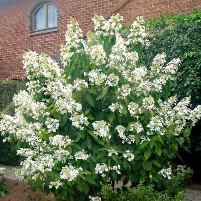 Раскидистый кустарник высотой до 2х иногда до 2х с половиной метров Ветви жесткие прямые, соцветия очень крупные, белоснежные. Цвет затем уходит в кремовый либо розовый в зависимости от кислотности почвы Идеально подходит для живых изгородей и солитерных посадок в больших садах