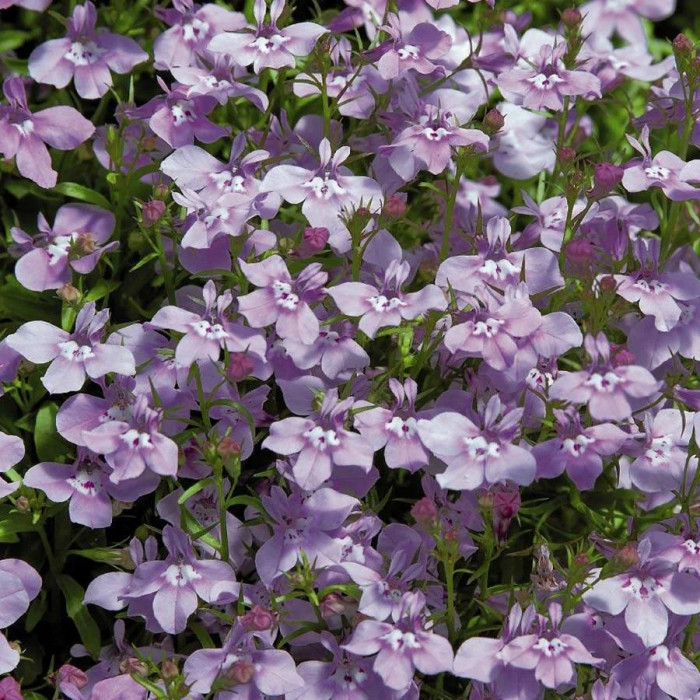 Лобелия относится к семейству Колокольчиковых. Рассада цветов мелкие синие, голубые, реже пурпурные, напоминают малюсенькие колокольчики. Куст ажурный, но достаточно плотный, пышно и долго цветет, цветки покрывают полностью весь куст, это выглядит очень ярко и красиво. Листочки мелкие, продолговатые. Во время цветения их почти не видно под цветочным ковром. Цветение длится долго: с мая по сентябрь. Отлично подходит для бордюров, колористических композиций.