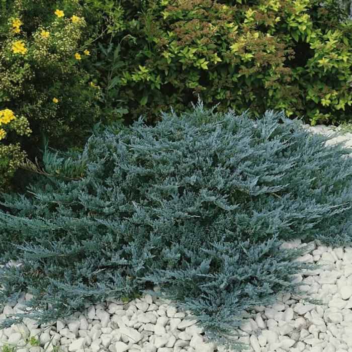 Можжевельник горизонтальный 'Blue Chip'-невысокий,стелющийся кустарник; высота до 0,3 м. Хвоя серебристо-голубая, зимой с пурпурным оттенком. Весной растение приобретает яркий голубой цвет, а к концу осени — фиолетовый. Корневая система кустарника хорошо разветвлена и размещается близко к поверхности.