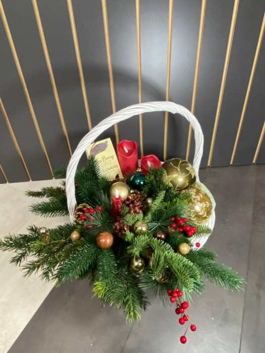 Подарочная корзина может быть реализована как с искусственной так и с живой хвоей. Наполнение по согласованию с заказчиком. Стоимость может меняться в зависимости от наполнения