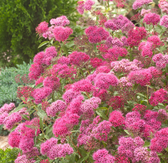СПИРЕЯ ЯПОНСКАЯ 'ANTHONY WATERER'- Компактный кустарник высотой 1 м, с раскидистой полушаровидной кроной и множеством прямостоячих побегов. Листья узкие, плотные, тёмно-зелёные, при распускании красноватые. Цветки ярко-карминные, собраны в крупные щитковидные соцветия до 15 см в диаметре .Зимостойка, в суровые зимы могут подмерзать концы молодых побегов.