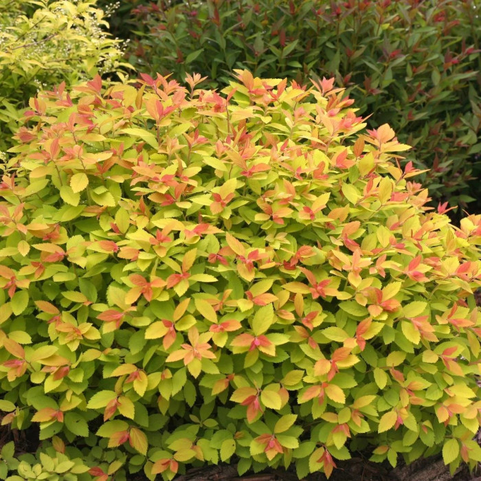 Спирея японская Голдфлейм - небольшой густой полукруглый кустарник. Цветет она с июля по сентябрь. Расцветка ее листвы меняется в зависимости от времени года. Так, весной листья имеют ярко зеленую окраску, позже – медно-оранжевый. Размещать спирею лучше в ажурной тени, например, от деревьев. Кустарник предпочитает рыхлые грунты, желательно кислые. Полив растению необходим регулярный, но умеренный. Нельзя допускать, чтобы вода застаивалась. Особенно внимательно надо следить за кустами в жару, не допуская пересыхания верхнего слоя земли. Применять спирею можно в качестве бордюрного растения, на клумбе или в качестве живых изгородей. Растение можно использовать как в одиночку, так и в союзе с другими. Великолепно смотрятся композиции «Голдфлейма» с сиренью, чубушником, ландышами, примулой.