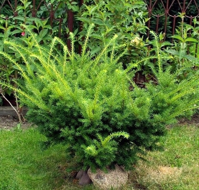 Тисс средний 'Farmen' - вечнозеленый медленнорастущий кустарник с плотной кроной, отлично подходит для невысоких живых изгородей, бордюров, небольших садов к 10 годам достигает 1метра в высоту и 1,2 метра в диаметре. теневынослив, любит увлажненные почвы, ядовит!!!