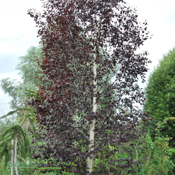 Береза повислая purpurea-дерево среднего размера до 10 (15) м с узкой кроной, тёмным стволом и поникающими тёмно-пурпурными побегами. Кора тёмно-серая, у молодых деревьев красновато-коричневая. Листья треугольные, 2–3 см длиной, при распускании тёмно-красные, затем тёмно-пурпурные; осенняя окраска от бронзовой до коричневато-красной. В кроне часто появляются возвратные побеги с обычными зелёными листьями, которые необходимо удалять. Нетребовательна.Морозостойка, но в суровые зимы может подмерзать. Эффектна в одиночных посадках.