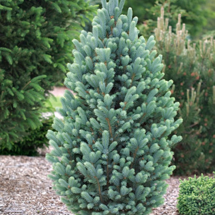 ЕЛЬ КОЛЮЧАЯ "ISELI FASTIGIATA" - Это высокое дерево 8-10 м и шириной до 3 м. Ежегодный прирост составляет 12 см, а порой и до 15 см. Её стволик ровный, как стрела, с обилием отходящих под углом ветвей. Хвоя плотная, средней длины до 2,5 см, молодые иголочки светлее, чем старые и отличаются серебристым оттенком голубого, поэтому до следующего сезона ель густо покрыта новыми более нежными по цвету иглами. Шишек не завязывает. Морозы держит прекрасно до - 35°С . Почвы предпочитает влажные, но без затопления, богатые органикой. Хорошо себя чувствует в условиях городов. Иногда требует формирующей обрезки.