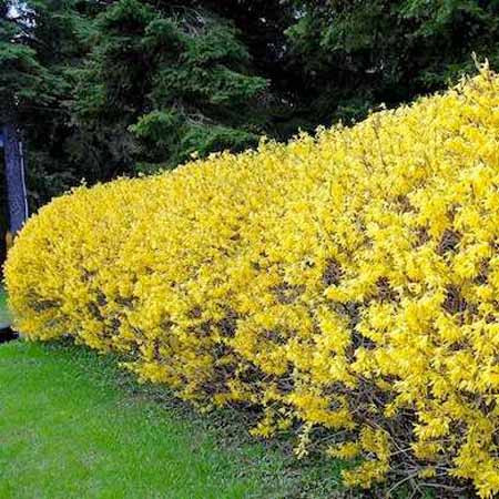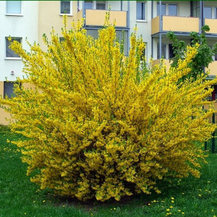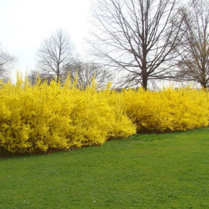 Форзиция средняя Голдзаубер – раскидистый кустарник до 2 м высотой. Листья темно-зеленые, с обратной стороны светлые. Рассада цветов крупные, насыщенного золотисто-желтого цвета. Хорошо переносит весенние заморозки. Цветет апрель-май до распускания листьев. Хорошо переносит городские условия. Используется для естественных и формированных цветущих живых изгородей в парках, садах, группами и одиночно. Зимостойкость в условиях Беларуси высокая.