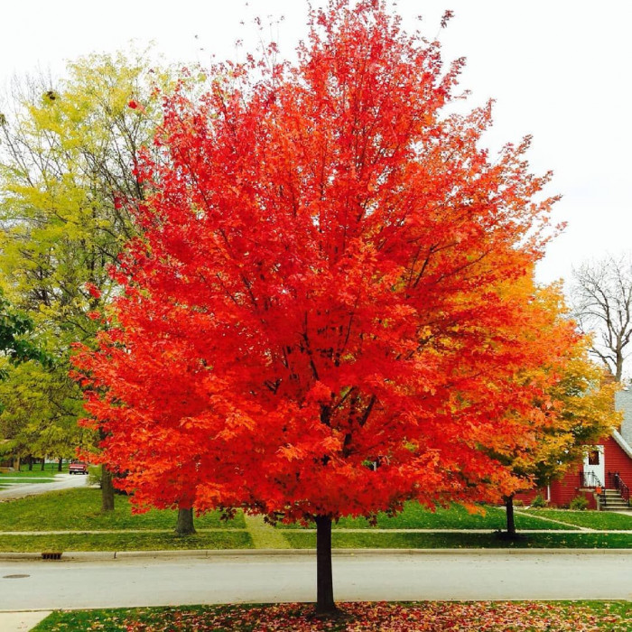 КЛЕН КРАСНЫЙ "RED SUNSET"-дерево с конической ,правильной кроной ,10-15 м высоты. Листья трехлопастные , летом темно-зеленые, глянцевые, осенью ярко-красные или оранжевые .Предпочитает влажные почвы , но растет и на сухих почвах .Один из самых красивых сортов, сохраняет свою яркую окраску до поздней осени.