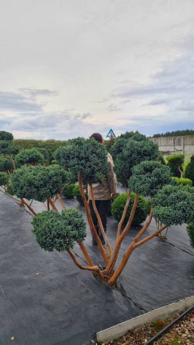 Стриженная форма можжевельника китайского. сформирована таким образом, чтобы полусферы моги сомкнуться через пару лет и образовать единую "шляпку" на нескольких стволах. растение смотрится очень эффектно. высота 140-160 см. диаметр - больше 120 см.
