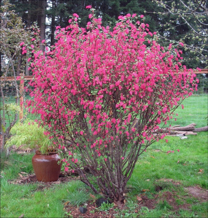 Смородина кроваво-красная – красивоцветущий кустарник высотой до 4 м с прямыми красновато-коричневыми побегами и раскидистой кроной. Листья темно-зеленые, 3-5-тилопастные, почковидно-округлые в очертании, с нижней стороны войлочно-опушенные, длиной до 8 см, при растирании издают насыщенный аромат, распространяющийся по округе. Цветки многочисленные, розовые или красные, трубчатые, диаметром до 1 см, собраны в поникающие кистевидные соцветия.Плоды некрупные, диаметром до 1 см, сине-черные с сизым налетом, они пригодны в пищу, но имеют пресный вкус. Цветет смородина кроваво-красная в мае, плоды созревают в августе (иногда раньше). В плодоношение культура вступает на 5 год после посадки. Может похвастаться устойчивостью к вредителям и болезням. В настоящее время опытными селекционерами было выведено несколько форм и сортов, отличающихся окраской цветков, листьев и другими незначительными признаками.