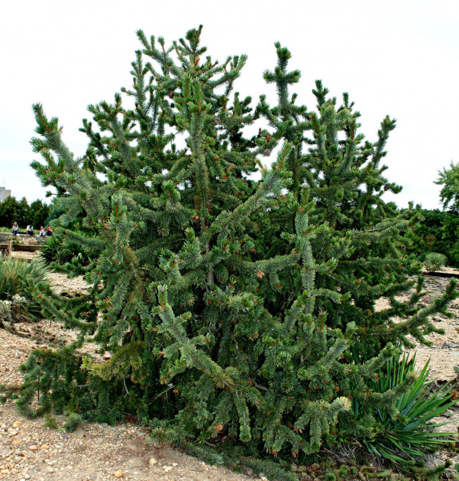 Сосна Остистая представляет собой Кустистое дерево, а иногда низкорослый кустарник, высотой не более 15 м., с приподнятыми, жесткими, короткими ветвями, в молодом возрасте равномерно стоящими. Кора молодых деревьев зеленая, гладкая; в старшем возрасте становится чешуйчатой. Вид не устойчив к ветрам. Растет очень медленно. Рекомендуется для малых приусадебных, каменистых садов, японских садиков.