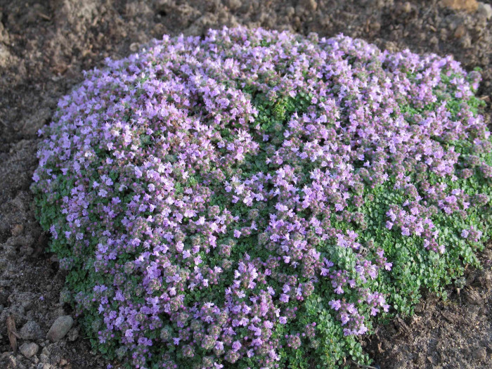 Тимьян - это многолетнее растение, так же его можно выращивать и как однолетник. Тимьян неприхотлив и жизнестоек. Трава не нуждается в подкормках и частых поливах. Достаточно просто выделить достаточно места для разрастания его побегов и разместить растение на солнечном и безветренном участке. Высота карликового тимьяна достигает 10 сантиметров. Он образует аккуратную подушку диаметром до 15 сантиметров.Тимьян отличный почвопокровник, легко переносит вытаптывание, поэтому может выступить хорошей альтернативой традиционному травяному газону. Так же его можно использовать в альпийских горках и в качестве бордюрного растения.